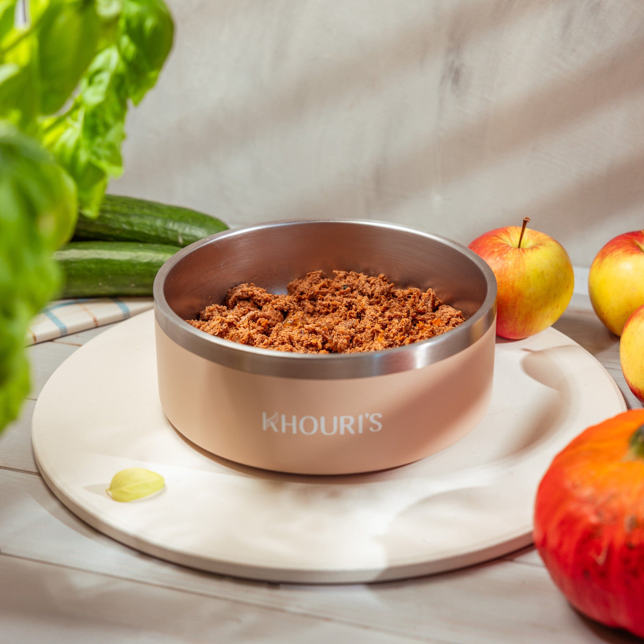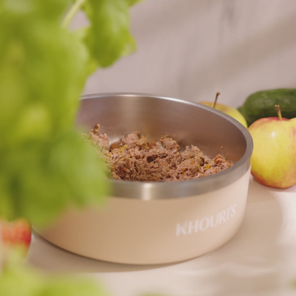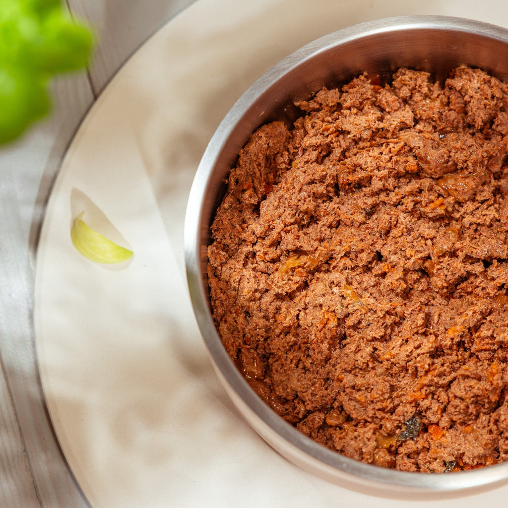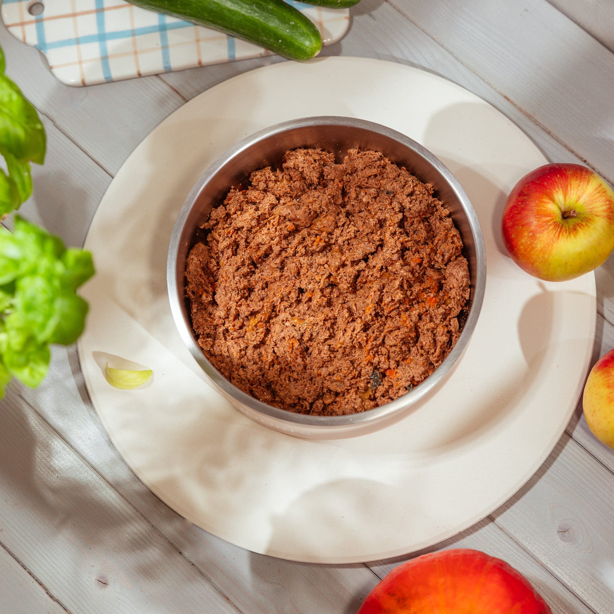 65% Bio-Lachs, 10% Bio-Hühnerherzen, 5% Bio-Hühnerleber, 7% Bio-Zucchini, 6% Bio-Karotten, 5% Lachsöl, 0,3% Seealgenmehl, 0,2% Taurin, 1,5% Flohsamenschalen